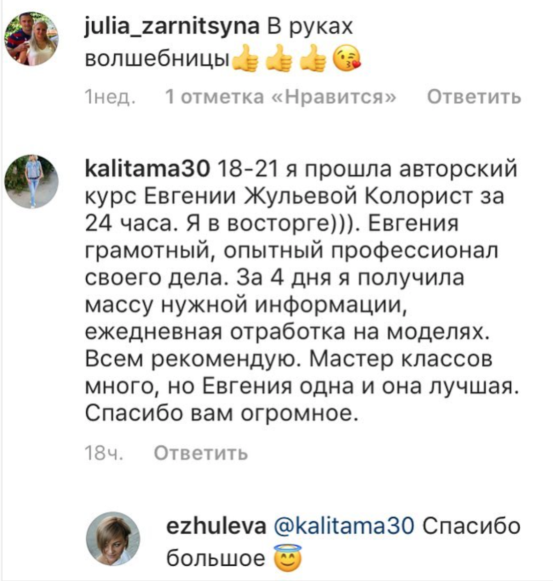 Давно искала такой курс и нашла! Я занимаюсь наращиванием много лет и давно хотела красить, но боялась :) Многие другие курсы мне не подходили, так как они идут по 3-4 месяца, да и отзывы были, что одна "вода". Этот курс идет всего 4 дня, нам дали столько материала, что первый день я чувствовала себя полной ду***й ))), но дальше поняла, что моя задача полученные знания и навыки перенести на практику. Да, я смогла! Это круто!